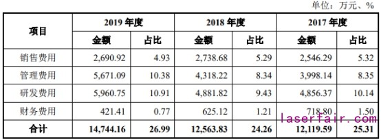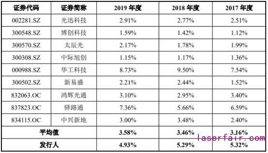 各期,仕佳光子銷售費(fèi)用分別為2546.29萬元、2738.68萬元、2690.92萬元,銷售費(fèi)用率分別為5.32%、5.29%、4.93%。同行銷售費(fèi)用率平均值分別為3.16%、3.46%、3.58%。