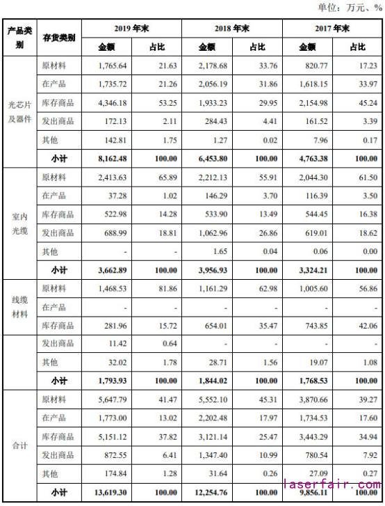 2017年末、2018年末和2019年末,仕佳光子存貨賬面金額分別為8606.09萬元、11005.70萬元和12689.65萬元,存貨余額分別為9856.11萬元、12254.76和13619.30萬元。