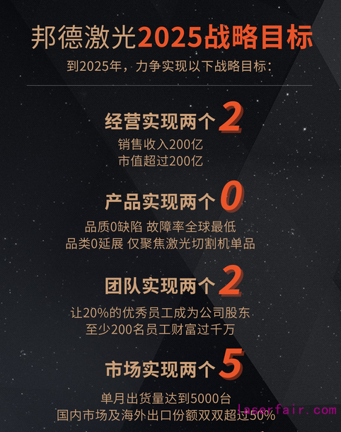 邦德激光致力于打造“全球激光切割機(jī)行業(yè)第一品牌”,在2020年這一全球經(jīng)濟(jì)發(fā)展的轉(zhuǎn)折年,邦德激光將抓住機(jī)遇,制定2025戰(zhàn)略目標(biāo)。而轉(zhuǎn)戰(zhàn)“科創(chuàng)板”或A股其他板塊,是邦德激光實(shí)現(xiàn)這一戰(zhàn)略目標(biāo)的重要步驟。