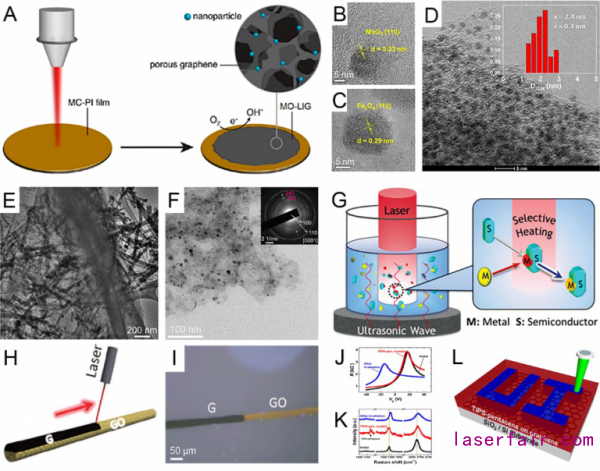 (J-L)有機物包覆石墨烯在激光輻照前后的電阻與柵極電壓曲線(J)、拉曼光譜(K)以及在石墨烯納米片上制備任意形狀p-n結(jié)的示意圖(L)。