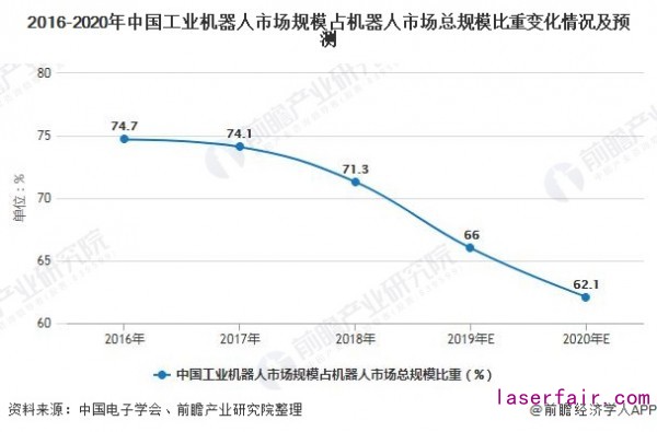但增速方面,現(xiàn)階段我國(guó)工業(yè)機(jī)器人市場(chǎng)規(guī)模擴(kuò)張速度明顯放緩,2018年我國(guó)工業(yè)機(jī)器人銷(xiāo)售額增速為5.9%,較2017年同比下降24.3個(gè)百分點(diǎn),估計(jì)2019年延續(xù)2018年緩慢增長(zhǎng)趨勢(shì)。受此影響,工業(yè)機(jī)器人在全國(guó)機(jī)器人市場(chǎng)總規(guī)模中的占比也逐漸下滑,2018年我國(guó)工業(yè)機(jī)器人市場(chǎng)規(guī)模在機(jī)器人市場(chǎng)總規(guī)模中占比超過(guò)70%,預(yù)計(jì)2020年將減少至62%左右。