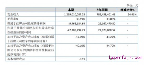 挖貝網(wǎng) 5月6日,邦德激光(838249)近日發(fā)布2019年年度報告,2019年公司實現(xiàn)營業(yè)收入1,219,010,087.25元,同比增長54.41%;實現(xiàn)歸屬于上市公司股東的凈利潤-9,462,184.6...