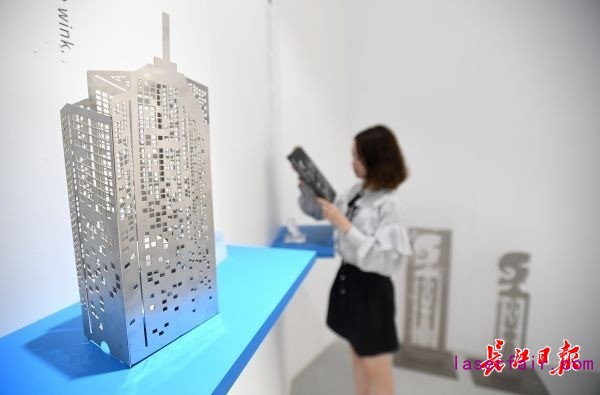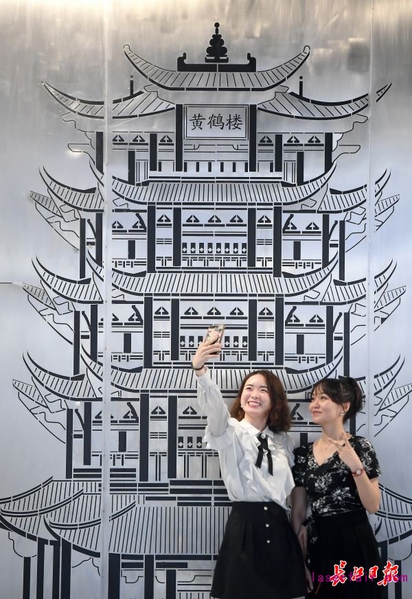 市民在華工科技智能制造產(chǎn)業(yè)園的華工激光博物館《黃鶴樓》前留影。