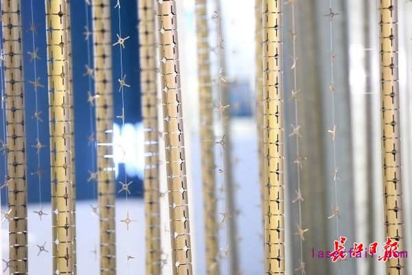 《簾幕無(wú)重?cái)?shù)》,采用激光切割銅管作為這個(gè)造型的主體,切下來(lái)的小花也把它做成了串飾進(jìn)行點(diǎn)綴,再加上背后幾塊鏡面交錯(cuò)的反射,整體呈現(xiàn)出一副“簾幕無(wú)重?cái)?shù)”的視覺(jué)效果。