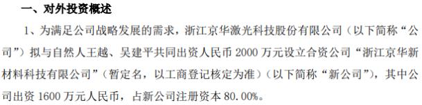 7月29日消息,京華激光(證券代碼:603607)發(fā)布公告稱,公司擬與自然人王越、吳建平共同出資人民幣2000萬元設(shè)立合資公司“浙江京華新材料科技有限公司”(暫定名,以工商登記核定為準(zhǔn)),其中公司出資1600萬元人民幣,占新公司注冊資本80.00%。