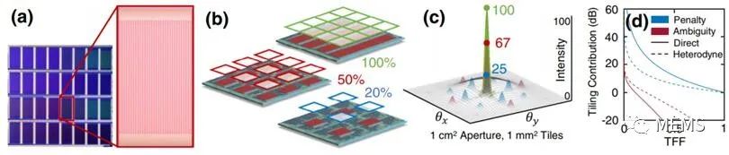 SOPA瓦片陣列形式的光束操縱。(a)完成制造的SOPA瓦片陣列的圖像。(b)不同瓦片填充系數(shù)(TFF)的SOPA瓦片陣列示意圖。(c)不同TFF值的SOPA瓦片陣列產(chǎn)生的輻射圖型(放大20倍)。(d)用于直接檢測和外差檢測時,TFF值與信噪比的關(guān)系圖。