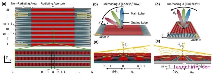 操縱2D波長的單個SOPA瓦片示意圖。(a)單個SOPA瓦片拓?fù)涫疽鈭D;M行光柵波導(dǎo)陣列(紅色)呈蛇形排布,與反激(藍(lán)色)串行連接。每行有N個光柵周期。(b)對光束的粗略(慢)操縱。(c)對光束的精細(xì)(快)操縱。(d)沿θx的粗略操縱,每個光柵波導(dǎo)將光衍射到與波長相關(guān)的齒到齒相位延遲決定的角。(e)沿θy方向的精細(xì)微調(diào),光柵陣列將光衍射到與波長相關(guān)的行到行相位延遲決定的角度。
