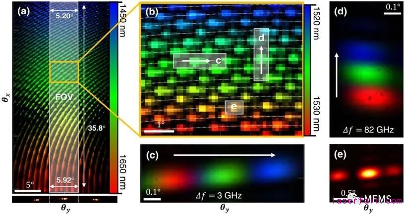 用單個SOPA瓦片演示2D波長操縱效果。(a)200 nm掃描的遠(yuǎn)場拍攝圖像,從16500個樣本中只取樣到1500個點(diǎn)。光柵瓣極限視場角為35.8° x 5.5°。為獲得可見度,采用掃描欠采樣(取樣率約10%)和飽和過度曝光的后處理,導(dǎo)致對角線曲線非實(shí)際掃描軌跡,曲率由群速度色散導(dǎo)致。底部顯示了1550 nm處的光斑圖,以顯示光柵波瓣受限的視場。(b)A 5° × 5.5°全掃描的分段,只有70個樣本。真實(shí)的掃描軌跡用虛線表示以引導(dǎo)人眼觀察,對顏色進(jìn)行重新編碼以適應(yīng)較窄的帶寬。(c)快軸波長掃描,三個不相鄰的點(diǎn)間距為3 GHz。(d)慢軸波長掃描,三個不相鄰的點(diǎn)間距為82 GHz。(e)1550 nm處的單波長光斑。