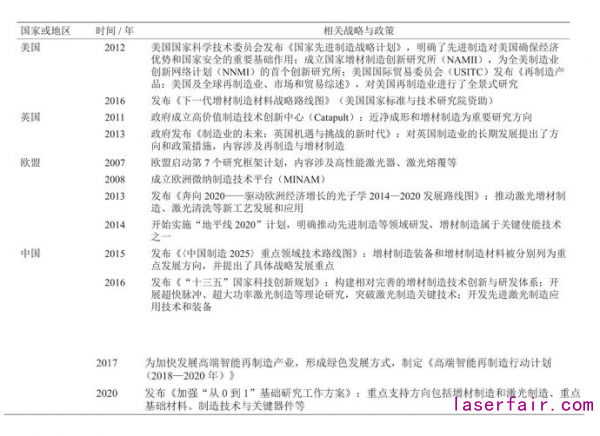 表 1 世界主要國(guó)家或地區(qū)激光再制造技術(shù)及產(chǎn)業(yè)相關(guān)戰(zhàn)略與政策