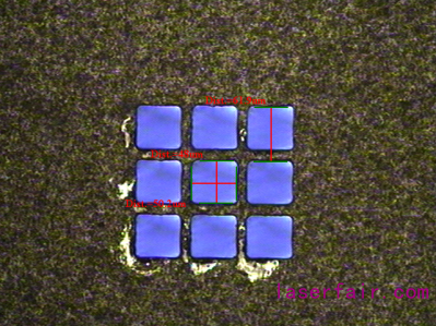 而激光旋切鉆孔技術(shù)則很好的解決了上述問題,既不受材料限制,又可加工高深徑比的無錐度孔。英諾激光利用自主開發(fā)的激光旋切鉆孔技術(shù)對探針卡微孔加工做了大量研究與實驗,當前可實現(xiàn)最小孔徑25μm,深徑比≧10:1,最大厚度達1mm的加工能力,圖7和圖8為英諾激光在Si3N4材料所鉆微孔的顯微照片。除圓孔外,還可加工某些探針卡需求的方孔,最小尺寸可達35×35μm,R角≦6μm,并且無錐度。圖9為50×50μm的方形孔,R角約6μm。