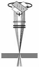 因此,得到高深徑比(≧10:1)、加工質(zhì)量高、零錐甚至倒錐的微孔是具有挑戰(zhàn)的,對于此類需求,最合適的加工方法是采用旋切頭模組,這種旋切頭不但可以使光束繞光軸高速旋轉(zhuǎn),還可改變光束相對材料表面的傾角β,改變β值就可實現(xiàn)從正錐到零錐甚至倒錐的變化。當前常用的旋切頭模組集中在四光楔掃描頭、道威棱鏡掃描頭和平行平板掃描頭,他們的光學(xué)原理大同小異,通過光學(xué)器件使進入聚焦鏡的光束進行適當?shù)钠揭坪蛢A斜,依靠高速電機的旋轉(zhuǎn)使光束繞光軸旋轉(zhuǎn),如圖2所示。