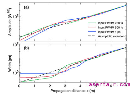 考慮到純四次孤子和常規(guī)孤子物理的相似性,同年,Runge等人理論上研究了脈沖在包含正四階色散和增益的介質(zhì)中的自相似傳播[2]。在四階正色散情況下,脈沖向新的漸進解演化,其時域和頻域曲線與二階色散情況下顯著不同。理論結(jié)果表明,隨著傳輸距離增加,脈沖保持其形狀不變,強度與T^{4/3}成正比,瞬時頻率和T^{1/3}成正比。該自相似脈沖的寬度和強度都呈指數(shù)增長,并且總增益的3/7用于增加脈沖寬度,4/7用于增加脈沖強度。