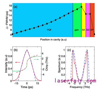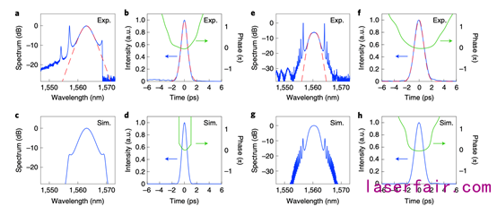 基于正四階色散中的自相似演化,作者模擬了一臺激光器系統(tǒng),如圖6a所示,腔內(nèi)包含7m長的無源四階色散光纖、1m長的有源四階色散光纖、可飽和吸收體、輸出耦合器和濾波器。輸出脈沖形狀和光譜如圖6b和6c所示,時域上為三角形脈沖,頻域上為雙峰結(jié)構(gòu),模擬結(jié)果與理論分析完全匹配。