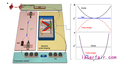 Runge等人利用光譜脈沖整形器實現(xiàn)了腔內(nèi)的色散控制,首次在光纖激光器中獲得了純四次孤子[1]。裝置如圖1所示,摻鉺光纖激光器采用非線性偏振旋轉(zhuǎn)鎖模機制,腔長21.4m,對應(yīng)的基階重復(fù)頻率為9.3MHz?;诳臻g光調(diào)制器的可編程脈沖整形器可以產(chǎn)生任意的相位控制腔內(nèi)色散,主要有兩個作用:(1)補償腔內(nèi)光纖引入的二階和三階色散;(2)提供大量的負四階色散。