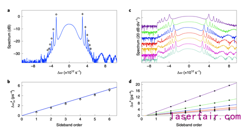 實驗上將邊帶頻率的四次方和其階次對應(yīng),如圖3b所示,發(fā)現(xiàn)滿足線性關(guān)系,與理論符合。并且,改變四階色散的值,仍然滿足線性關(guān)系,如圖3d所示。