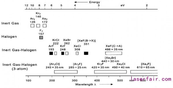 理論上說,準(zhǔn)分子激光可以覆蓋從深紫外126 nm到可見波段約670 nm。但常用的準(zhǔn)分子激光波長主要處于紫外波段。