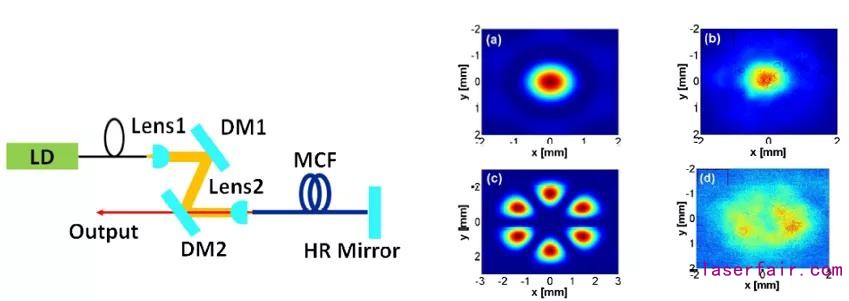 圖3實(shí)驗(yàn)裝置圖(左圖)和輸出光斑(右圖);同相模式遠(yuǎn)場(chǎng)強(qiáng)度的計(jì)算結(jié)果(a)和實(shí)驗(yàn)結(jié)果(b);異相模式遠(yuǎn)場(chǎng)強(qiáng)度的計(jì)算結(jié)果(c);高反鏡與光纖端面距離小于1 mm時(shí)的輸出光斑 [1]