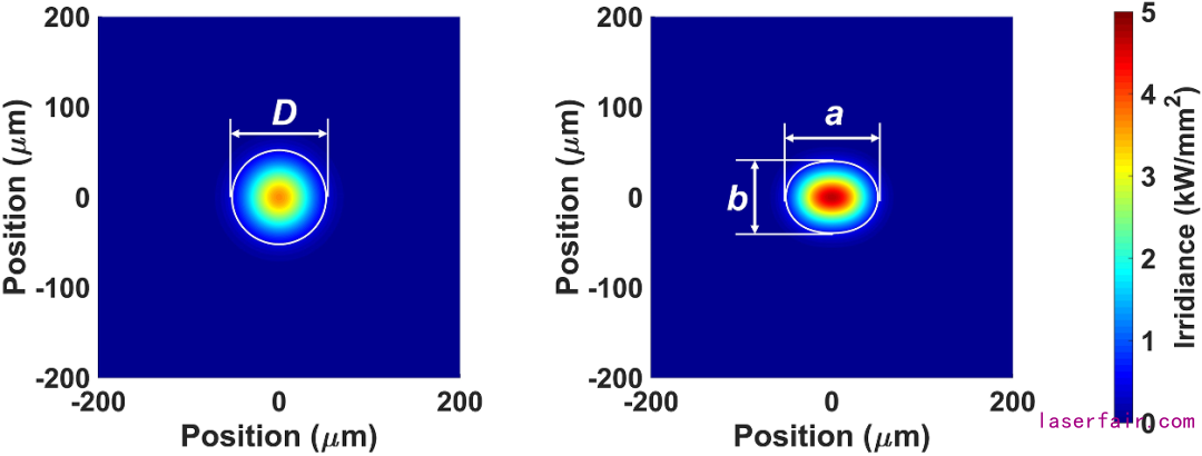圖2單高斯束圓形和雙高斯束耦合橢圓激光光斑截面能量分布圖
