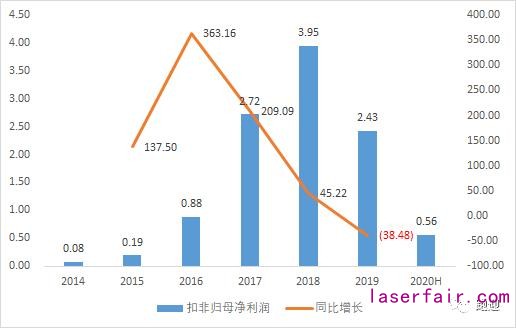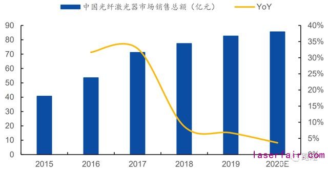 根據(jù)2020 中國激光產(chǎn)業(yè)發(fā)展報告,2019 年中國光纖激光器市場銷售總額 85.6 億元,同比增長 6.72%,受全球經(jīng)濟(jì)不確定性影響預(yù)計 2020 年同比增長 3.63%,短期增速有所放緩,伴隨中國制造業(yè)逐漸復(fù)蘇不改長期增長趨勢。