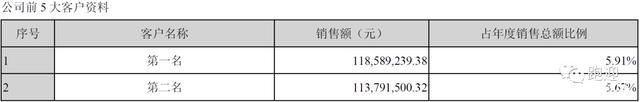 2019年前五大客戶實(shí)現(xiàn)營收4.23億元,占比21.05%,其中第一大客戶實(shí)現(xiàn)營收1.19億元,占比5.91%。