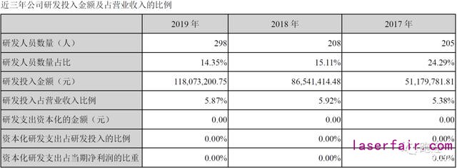 根據(jù)公司的總體發(fā)展戰(zhàn)略,公司的研發(fā)主要圍繞高功率光纖激光器及其關(guān)鍵器件等項目進(jìn)行。公司持續(xù)加大研發(fā)投入,為公司的持續(xù)發(fā)展提供強(qiáng)有力的技術(shù)支撐和產(chǎn)品支撐,并為公司未來的發(fā)展培育新的增長點(diǎn)。2019年度,公司研發(fā)費(fèi)用總額11,807.32萬元,占公司營業(yè)收入的比例為5.87%,占公司歸屬于上市公司所有者權(quán)益的比例為5.15%。
