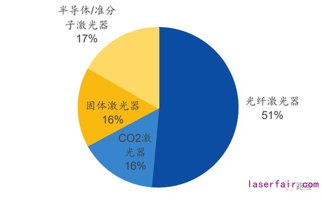 光纖激光器市場份額占比從 2013年的33.8%提升至 2018年的 51.5%,成為市場最大激光器品種。根據(jù) Strategies Unlimited 公告的數(shù)據(jù),2010-2018 年光纖激光器市場銷售規(guī)模從3.3 億美元上升至 26.0 億美元,年復(fù)合增長率 26.0%。2019 年預(yù)計光纖激光器銷售收入可達(dá) 27.46 億美元,有望步入穩(wěn)中有進(jìn)階段,未來市場空間廣闊。固體激光器、氣體激光器和半導(dǎo)體激光器的市場份額逐年下降,2018 年份額分別為 15.7%、16.2%和 16.7%。