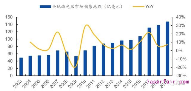 據(jù)中國科學(xué)院武漢文獻(xiàn)情報中心、中國激光雜志社、中國光學(xué)學(xué)會統(tǒng)計,2019 年全球激光器銷售額 147.3 億美元,同比增長 7.1%,自 2018 年中美貿(mào)易戰(zhàn)開始,激光產(chǎn)品進(jìn)出口受到一定沖擊,2018 年激光產(chǎn)業(yè)規(guī)模增速大跌至 5.27%,伴隨貿(mào)易戰(zhàn)緩解,產(chǎn)業(yè)規(guī)模增速呈回升趨勢,2019 年增速同比提升 2.88 個百分點(diǎn)。2020 年受全球經(jīng)濟(jì)增速放緩及新冠疫情影響,預(yù)計 2020 年全球激光器產(chǎn)業(yè)規(guī)模將有所收縮。