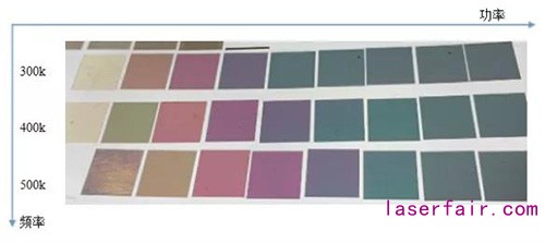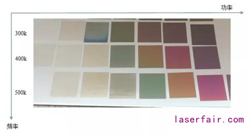 功率是能夠影響激光單脈沖輸出最主要最直觀的控制變量,經(jīng)過(guò)測(cè)試后發(fā)現(xiàn),在不銹鋼打彩時(shí),頻率在和脈寬進(jìn)行“較量”,頻率這一參數(shù)對(duì)色彩變化的影響更為豐富些。