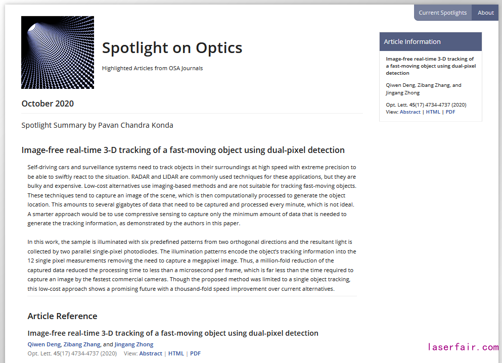 圖1. 鐘金鋼教授團隊在在美國光學(xué)學(xué)會權(quán)威期刊Optics Letters上發(fā)表的題為“Image-free real-time 3-D tracking of a fast-moving object using dual-pixel detection”的研究論文