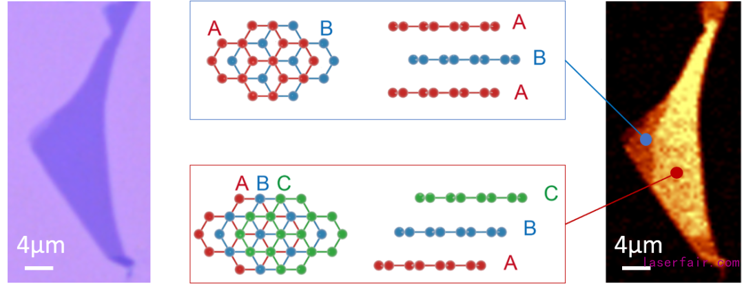 針對(duì)上述問題,國(guó)防科技大學(xué)聯(lián)合國(guó)內(nèi)外多家科研單位開展合作,首次在機(jī)械解離的三層石墨烯中實(shí)現(xiàn)了由激光輻照誘導(dǎo)的從ABC堆垛到ABA堆垛的有序結(jié)構(gòu)相變。實(shí)驗(yàn)結(jié)合共聚焦拉曼光譜顯微鏡、光學(xué)二次諧波和掃描近場(chǎng)光學(xué)顯微鏡等手段詳細(xì)研究了相變前后石墨烯的晶體結(jié)構(gòu)和光學(xué)特性。