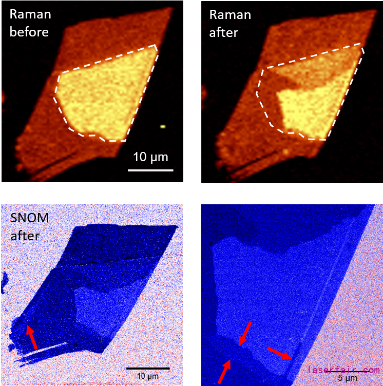 圖5 激光輻照前后六層石墨烯的拉曼成像與S-SNOM成像對(duì)比