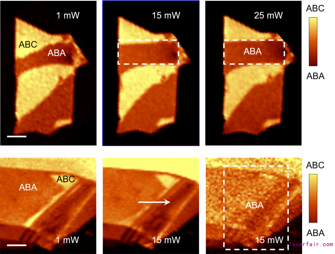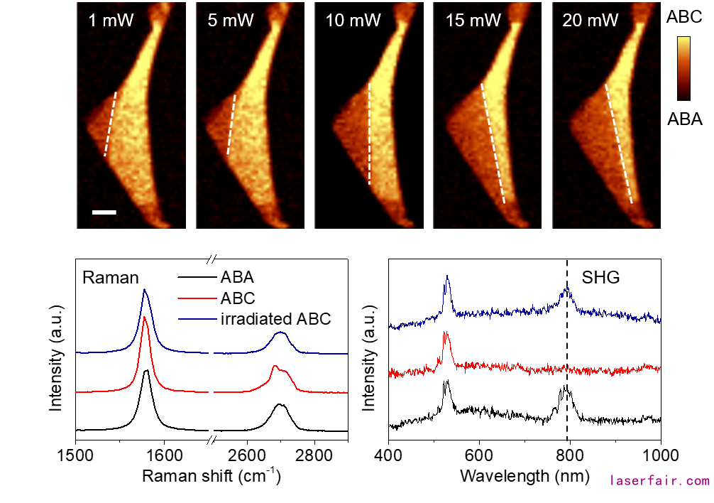光學(xué)顯微鏡無法區(qū)分TLG中的ABA和ABC堆垛,本研究利用拉曼光譜2D特征峰的差異來判斷其堆垛結(jié)構(gòu),并通過共聚焦拉曼光譜顯微鏡對(duì)TLG進(jìn)行了亞微米尺度的掃描成像(圖2),其中ABA堆垛(暗)和ABC堆垛(明)之間的界面即為疇壁(domain wall)。除了拉曼光譜,光學(xué)二次諧波(SHG)也被用于表征TLG的ABA和ABC堆垛,因?yàn)榍罢呤侵行姆囱輰?duì)稱破缺的,有SHG特征,而后者是中心反演對(duì)稱的,沒有SHG響應(yīng)。論文中利用激光對(duì)TLG進(jìn)行了面掃描輻照,每次輻照完成后都進(jìn)行一次拉曼成像。實(shí)驗(yàn)結(jié)果表明,ABA-ABC疇壁在激光的驅(qū)動(dòng)下產(chǎn)生了明顯的移動(dòng)。隨后,細(xì)致的拉曼光譜和SHG譜學(xué)測(cè)量也證明了TLG中從ABC堆垛到ABA堆垛的結(jié)構(gòu)相變(圖3)。