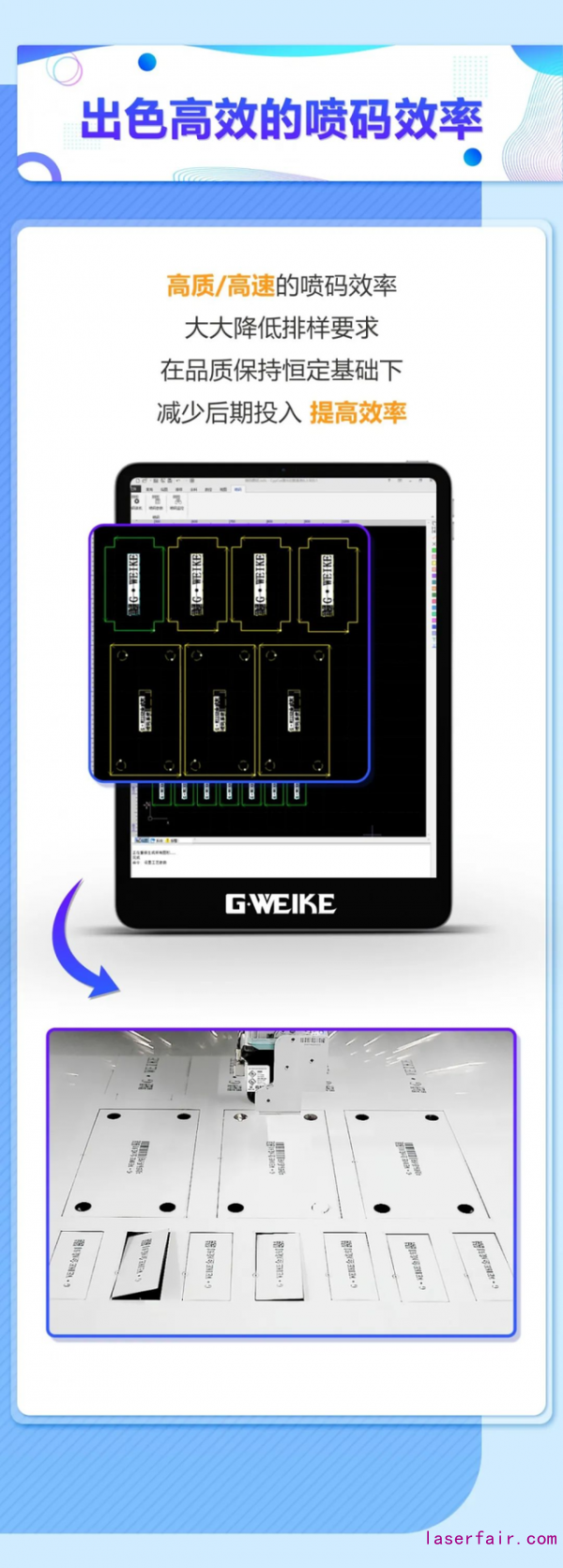 針對以上切割加工痛點(diǎn),金威刻將激光切割與智能噴碼系統(tǒng)融合為一,金威刻激光噴碼系統(tǒng)是可變數(shù)據(jù)、高速噴印、防偽,二維碼溯源等應(yīng)用領(lǐng)域下對切割市場的需求催生的新型噴碼功能。