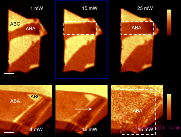 光學(xué)顯微鏡無法區(qū)分TLG中的ABA和ABC堆垛,本研究利用拉曼光譜2D特征峰的差異來判斷其堆垛結(jié)構(gòu),并通過共聚焦拉曼光譜顯微鏡對TLG進(jìn)行了亞微米尺度的掃描成像(圖2),其中ABA堆垛(暗)和ABC堆垛(明)之間的界面即為疇壁(domain wall)。除了拉曼光譜,光學(xué)二次諧波(SHG)也被用于表征TLG的ABA和ABC堆垛,因?yàn)榍罢呤侵行姆囱輰ΨQ破缺的,有SHG特征,而后者是中心反演對稱的,沒有SHG響應(yīng)。論文中利用激光對TLG進(jìn)行了面掃描輻照,每次輻照完成后都進(jìn)行一次拉曼成像。實(shí)驗(yàn)結(jié)果表明,ABA-ABC疇壁在激光的驅(qū)動下產(chǎn)生了明顯的移動。隨后,細(xì)致的拉曼光譜和SHG譜學(xué)測量也證明了TLG中從ABC堆垛到ABA堆垛的結(jié)構(gòu)相變(圖3)。