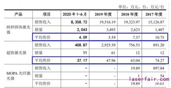 然而,作為“全球少數(shù)具有納秒、亞納秒、皮秒、飛秒級(jí)微加工激光器核心技術(shù)和生產(chǎn)能力的廠商”,英諾激光目前超快激光器收入占比尚小,2020年上半年僅銷售11臺(tái),收入占比不足5%。此外,隨著產(chǎn)品單價(jià)的腰斬,該產(chǎn)品毛利率也由76.09%下滑至59.90%。