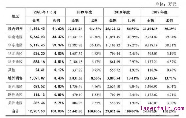 國(guó)內(nèi)市場(chǎng)日趨激烈,國(guó)外市場(chǎng)狀況也不容樂(lè)觀。受中美貿(mào)易摩擦等因素影響,英諾激光近幾年境外銷售受阻,境外收入及占比持續(xù)下降趨勢(shì)明顯。而在新冠疫情的沖擊下,2020年上半年英諾激光境外收入僅為1091.09萬(wàn)元,占比僅為8.4%,較2017年下滑超過(guò)5個(gè)百分點(diǎn)。