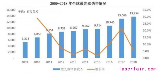 實(shí)際上,激光行業(yè)由于下游應(yīng)用分布廣泛,行業(yè)受到單一行業(yè)周期性變化影響并不明顯,但受宏觀經(jīng)濟(jì)周期影響仍然較大。數(shù)據(jù)顯示,2009至 2018年,全球激光器市場(chǎng)復(fù)合增長(zhǎng)率為11.14%,但2018年增速已經(jīng)降至5%左右。