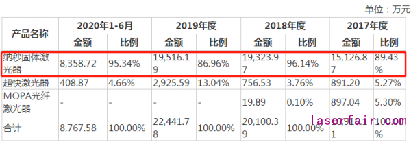 招股書顯示,英諾激光的激光器業(yè)務(wù)以銷售納秒固體激光器和超快激光器為主,2017-2020年上半年,上述兩類激光器的銷售收入占該公司激光器銷售收入的比例分別為94.7%、99.9%、100%和100%。其中納秒固體激光器銷售金額分別為1.51億元、1.93億元、1.95億元和0.84億元,占激光器銷售總收入的比例分別為89.43%、96.14%、86.96%和95.34%,是英諾激光的核心主導(dǎo)產(chǎn)品。