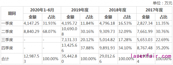 招股書顯示,英諾激光的營(yíng)業(yè)收入易受季節(jié)波動(dòng)影響,具體而言,其第二、四季度主營(yíng)業(yè)務(wù)收入占比高于第一、三季度。