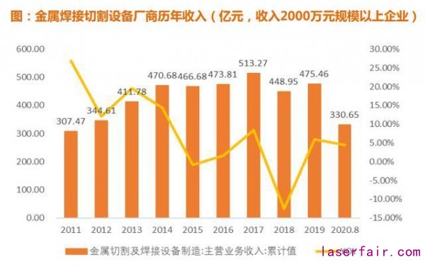 焊接市場空間廣闊,根據(jù)國家統(tǒng)計局數(shù)據(jù),規(guī)模以上金屬焊接切割廠商年收入合計達到475.46億(2019年);
