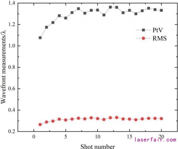 泵浦源系統(tǒng)的能量穩(wěn)定性對于超強(qiáng)超短激光裝置至關(guān)重要,實驗針對激光器在不同重復(fù)頻率條件下工作所產(chǎn)生的熱致波前畸變進(jìn)行測量,以此確定能夠使系統(tǒng)穩(wěn)定安全工作的重復(fù)頻率。熱效應(yīng)實驗采用波前探測儀進(jìn)行測量,用其測量出的PtV和RMS值可反映出光束質(zhì)量受熱效應(yīng)影響的大小。