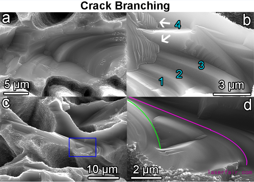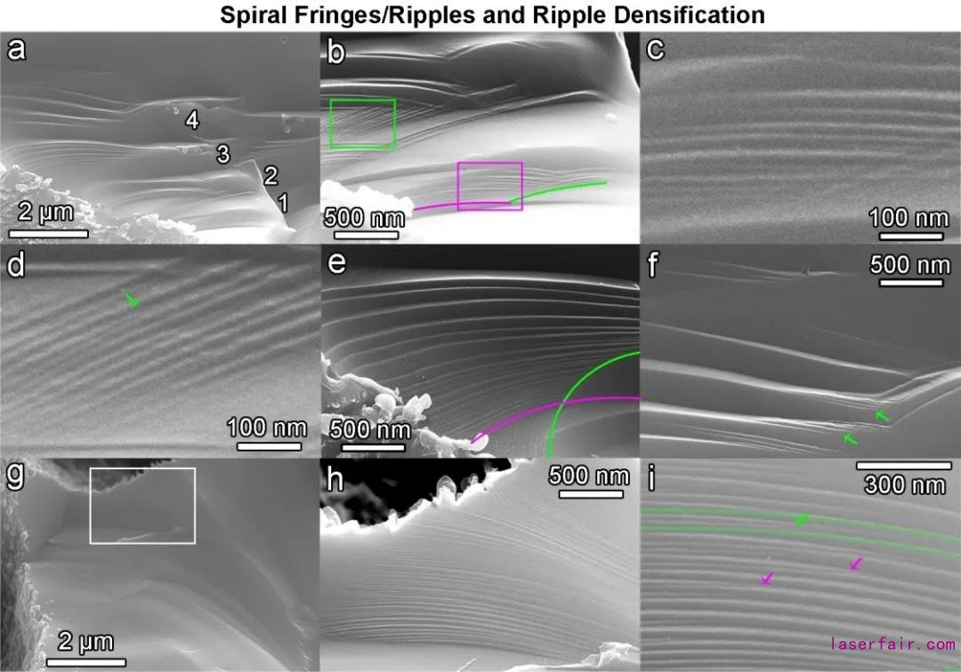 En échelon 微紋痕及納米拋物線狀紋痕 圖4展現(xiàn)了典型的en échelon微紋痕及其納米拋物線狀紋痕。碎裂起始于溝槽的一個(gè)角落(圖4a),然后沿著平行溝槽的方向傳輸。在碎裂傳輸?shù)倪^(guò)程中,裂紋的強(qiáng)度和方向會(huì)不斷變化,產(chǎn)生一系列en échelon微紋痕及其納米拋物線狀紋痕。碎裂紋痕可分為三種典型的結(jié)構(gòu),如圖4b三種不同顏色所表示。紅色標(biāo)識(shí)勾畫了一系列始于碎裂起始點(diǎn)(starting point)的en échelon微紋痕,在其間分布著大面積的納米拋物線狀紋痕(綠色標(biāo)識(shí)區(qū)域),如圖4d-f所示。粉色標(biāo)識(shí)表明縱向碎裂傳播會(huì)形成一系列拋物線型臺(tái)階狀結(jié)構(gòu),在圖4m更明顯。在每層臺(tái)階上,會(huì)分布著一系列不同取向的納米結(jié)構(gòu)(圖4n-o),表明碎裂可以在不同維度同時(shí)傳播。圖4g-h和圖4j-k顯示裂紋傾向于先向下傳輸然后再向頂端傳輸,形成多達(dá)6層深度逐步遞減的拋物線型微米臺(tái)階結(jié)構(gòu)(圖4h)和數(shù)層“弧形”納米紋痕(圖4l)。在高度非突變(高度突變?nèi)鐖D4n)的微米臺(tái)階結(jié)構(gòu)上會(huì)生成大面積納米拋物線狀紋痕(圖4h-i),表明大尺度碎裂傳播過(guò)程中伴隨著一系列納米尺度的碎裂波前震動(dòng)。圖4c-d表明許多納米紋痕演變成HSFLs或珍珠狀納米顆粒,此現(xiàn)象將在圖9詳細(xì)表征和分析。