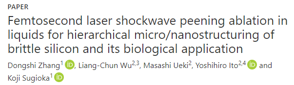 Zhang D S, Wu L C, Ueki M, Ito Y, Sugioka K. Femtosecond laser shockwave peening ablation in liquids for hierarchical micro/nanostructuring of brittle silicon and its biological application. Int. J. Extrem. Manuf. 2, 045001 (2020).