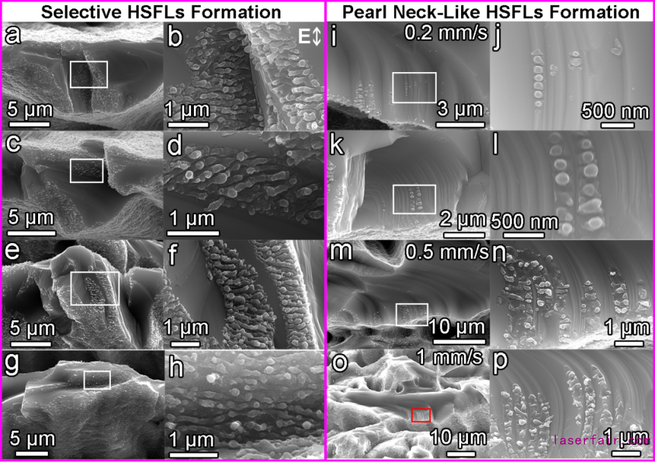 碎裂紋痕納米尺度重構(gòu)正常情況下,碎裂紋痕的表面應(yīng)該是光滑的,但是實(shí)驗(yàn)發(fā)現(xiàn)在碎裂結(jié)構(gòu)的邊緣和相對(duì)密閉的空間生成了高頻周期結(jié)構(gòu)HSFLs,如圖9a-h所示。這表明沖擊波會(huì)對(duì)碎裂的納米紋痕進(jìn)行重構(gòu)。通過(guò)Raman測(cè)試,發(fā)現(xiàn)HSFLs結(jié)構(gòu)的形成與硅無(wú)定形化有關(guān)。由于沒(méi)有明顯的熱融化痕跡,材料的無(wú)定型化應(yīng)該是氣泡破裂產(chǎn)生的相對(duì)比較溫和的沖擊波導(dǎo)致的晶格缺陷和堆疊位錯(cuò)所引起的。當(dāng)納米紋痕間隔在100-200納米范圍之內(nèi),納米紋痕被重構(gòu)成珍珠項(xiàng)鏈狀納米顆粒陣列,如圖9i-p所示。此種結(jié)構(gòu)在低掃描速度下相對(duì)比較均勻和完整,而在高掃描速度下則比較混亂,表明改變掃描速度可以改變納米紋痕局部的應(yīng)力場(chǎng)。