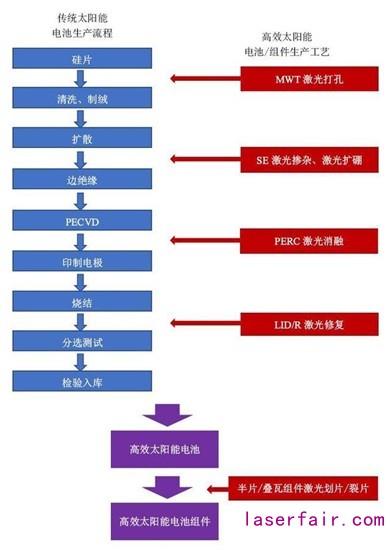 與傳統(tǒng)的太陽(yáng)能電池生產(chǎn)加工流程相比,現(xiàn)代高效太陽(yáng)能電池、組件生產(chǎn)工藝有無(wú)法比擬的優(yōu)勢(shì),其中激光技術(shù)在太陽(yáng)能電池生產(chǎn)加工中功不可沒,例如:薄膜電池的激光劃線、PERC電池激光開槽、晶硅電池的開膜、摻雜、激光切割晶圓、激光打孔、激光刻邊等。以其精確的圖案化局部加工和快速切割能力,激光加工成為提升光伏產(chǎn)品轉(zhuǎn)換效率的重要方式。