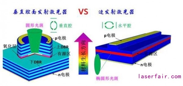 VCSEL本質(zhì)上是一種半導(dǎo)體激光器,激光器是用來(lái)發(fā)射激光的裝置,而半導(dǎo)體激光器則是以半導(dǎo)體材料為工作物質(zhì)發(fā)射激光的器件,根據(jù)激光芯片的結(jié)構(gòu),半導(dǎo)體激光器可分為邊發(fā)射激光器(EEL)和垂直腔面發(fā)射激光器(VCSEL)。