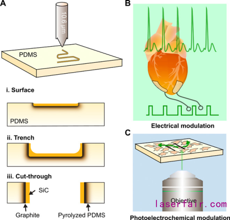 通過(guò)這種方法,Vishnu Nair及其同事們展示了如何用激光在PDMS基底上二維地或三維地刻寫出氮摻雜的3C-SiC。得到的SiC層與PDMS形成了軟硬的無(wú)縫接合。這種柔性器件可以作為離體心臟的刺激電極,亦可以作為光電極在局部產(chǎn)生過(guò)氧化氫。這些科學(xué)家們的目標(biāo)是將這種半導(dǎo)體-柔性體復(fù)合材料無(wú)縫整合到對(duì)“芯片上的器官”或“芯片上的類器官”的研究中,或者利用其光電化學(xué)性質(zhì)將其整合到微流體系統(tǒng)中。之后的研究也會(huì)更為準(zhǔn)確地探究這種器件產(chǎn)生過(guò)氧化氫的電化學(xué)機(jī)理。
