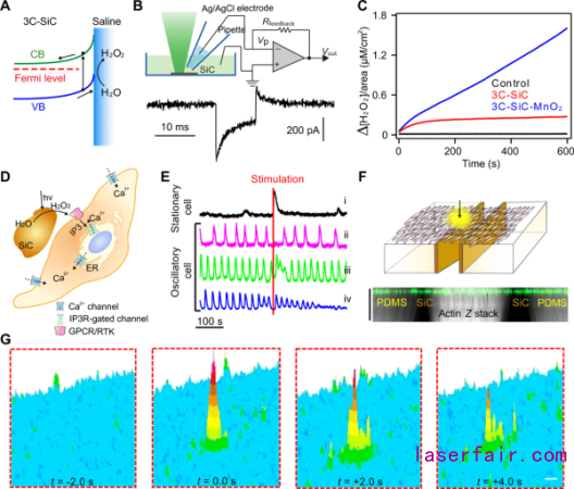 Nair等人在這一工作中使用碳化硅的原因在于其在半導(dǎo)體工業(yè)中的重要性。盡管其合成需要嚴(yán)苛的條件,立方3C晶型的碳化硅(3C-SiC)仍具有高電子遷移率,高熱導(dǎo)率,以及高飽和漂移速率的特點(diǎn)。該研究團(tuán)隊(duì)使用PDMS(聚二甲基硅氧烷)作為前體,展示了3C-SiC通過(guò)激光刻寫得到的二維和三維圖樣。通過(guò)在富氮?dú)夥障率褂眉す鉄g,他們得到了一層致密的碳化硅層,進(jìn)而按照預(yù)想的幾何形狀制備出這種復(fù)合材料。碳化硅在嵌入的石墨網(wǎng)絡(luò)的幫助下,展現(xiàn)出了贗電容性的電化學(xué)性質(zhì)和光電化學(xué)活性。研究者們又使用二氧化錳將碳化硅功能化,以進(jìn)一步提升其光電化學(xué)活性。利用這些基于碳化硅的器件,他們成功在離體心臟和培養(yǎng)的細(xì)胞中實(shí)現(xiàn)了對(duì)生命活動(dòng)的操控。這項(xiàng)工作展現(xiàn)出了激光刻寫是如何為生物界面研究高效地制造靈活的多功能柔性半導(dǎo)體材料的。