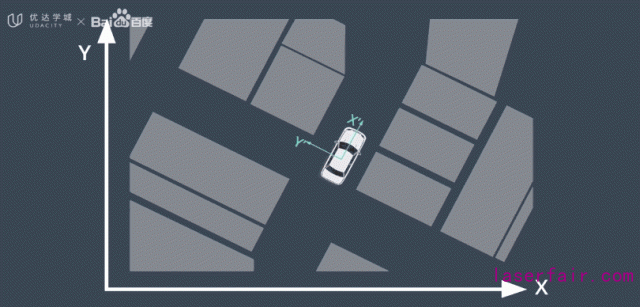 我們在車輛自身的坐標(biāo)系中測量這些距離,以及靜態(tài)障礙物的方向。在車輛自身的坐標(biāo)系中,汽車的前進(jìn)方向始終向前,當(dāng)汽車左轉(zhuǎn)或右轉(zhuǎn)時,坐標(biāo)系與汽車一同旋轉(zhuǎn),以使車輛的前進(jìn)方向在坐標(biāo)系中繼續(xù)向前。隨著車輛的轉(zhuǎn)彎,車輛自身的坐標(biāo)系必然與地圖坐標(biāo)不一致(見圖3),車輛的坐標(biāo)和地圖的坐標(biāo)可能都取決于手機導(dǎo)航系統(tǒng)中的設(shè)置。