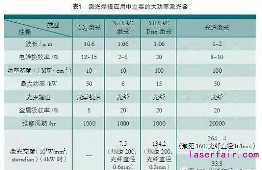 激光焊接是將高強度激光輻射至金屬表面,通過激光與金屬間熱力耦合作用使金屬熔化再冷卻結(jié)晶形成焊縫的技術(shù)。根據(jù)激光焊接的熱作用機制可分為熱導(dǎo)焊和深熔焊兩種,前者主要應(yīng)用于精密零件的封裝焊接或微納焊接;后者在焊接過程中往往產(chǎn)生類似于電子束焊接的小孔效應(yīng),形成深寬比較大的焊縫。激光深熔焊接實現(xiàn)需要的激光功率高,該技術(shù)目前應(yīng)用于激光深熔焊接的大功率激光主要有4種類型,其特點如表1所示。